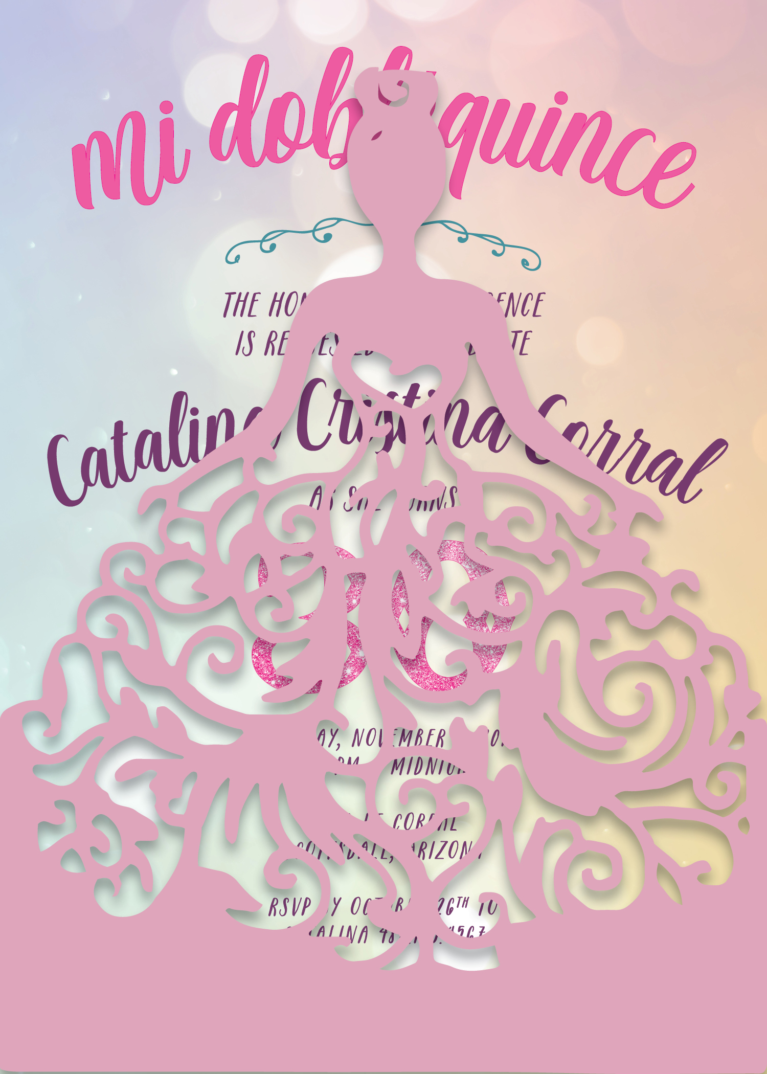 A quinceañera can be as extravagant as a wedding but made for a princess. My design featured a laser cut princess pocket-card, which held the precious invitation. I designed the invite with whimsy, fantasy, and royalty in mind.